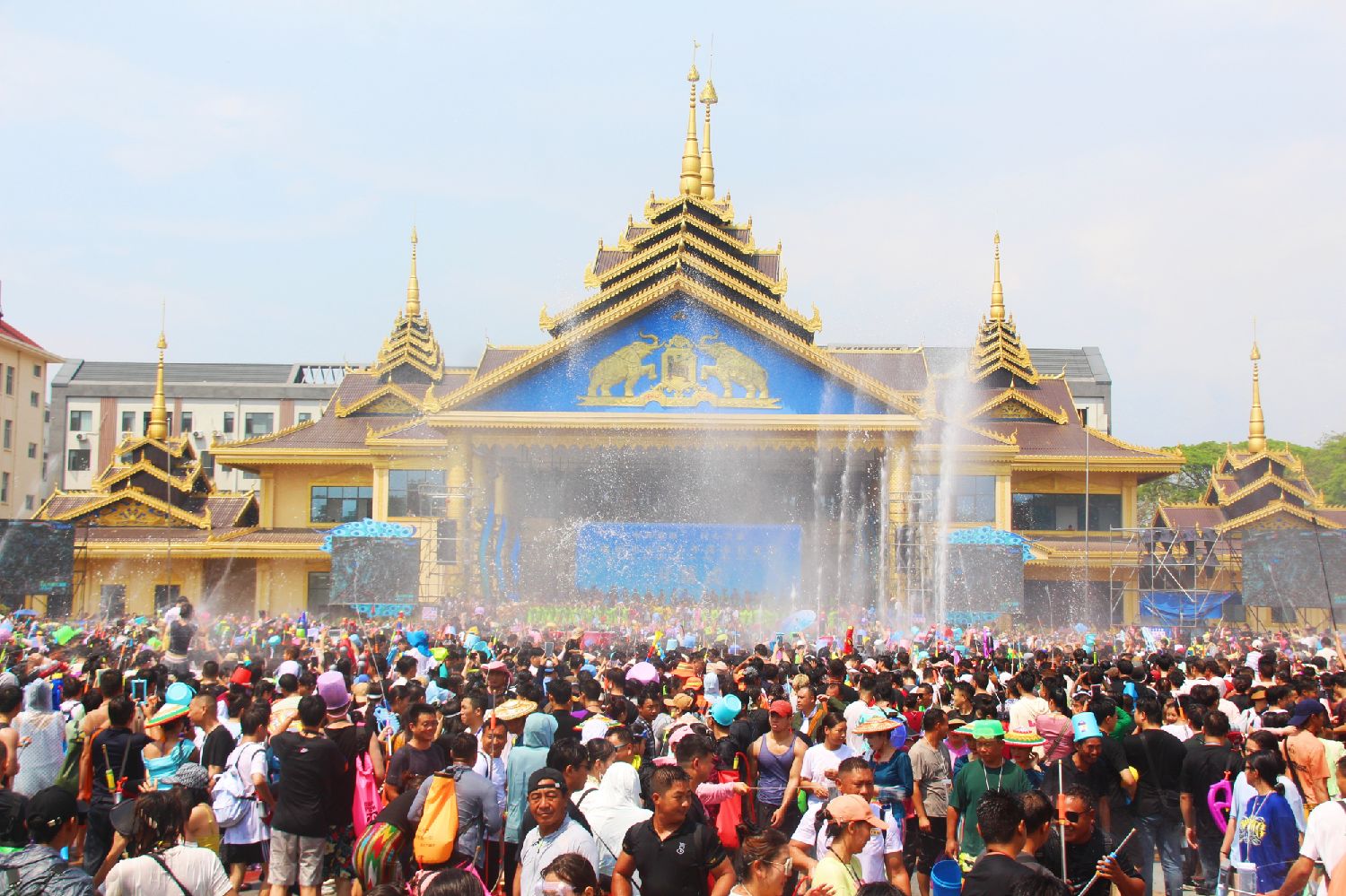 4月13日,云南德宏州瑞丽,傣族德昂族以及全体游客共同跳起民族舞蹈“嘎伴光”,泼水节正在激情上演,台上台下进行泼水互动。(CFP)