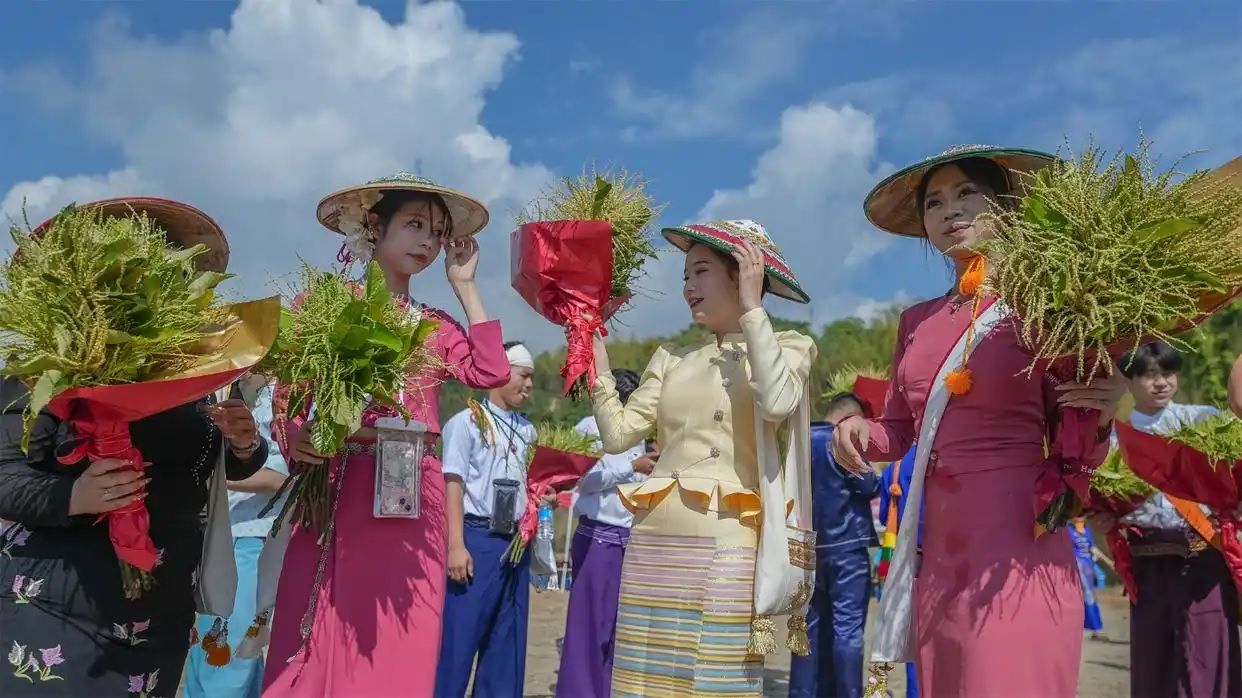 4月12日,云南德宏州,瑞丽2025年傣族、德昂族泼水狂欢节采花活动在勐秀乡南京里刀坝欢乐开场。身着鲜艳服装的傣族同胞和各方宾朋在山林里采摘赏建花。傣族舞蹈、乐器演奏等传统节目轮番上演,宾客们在欢乐互动中感受着民族文化的独特魅力。(《云南日报》)