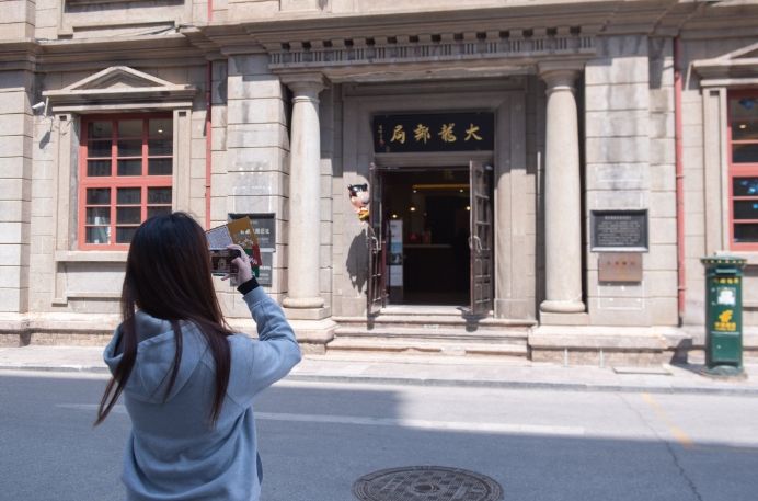 2025年4月,游客在烟台大龙邮局建筑前拍照。(图/中新社)