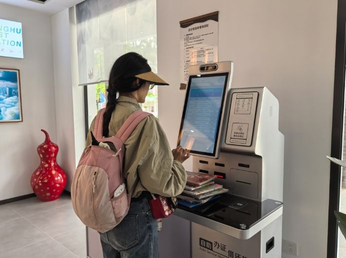 2025年4月,开办在湖南洋湖国家湿地公园附近的社区图书馆内,读者正通过借还一体机自助还书。 (图/中新社)