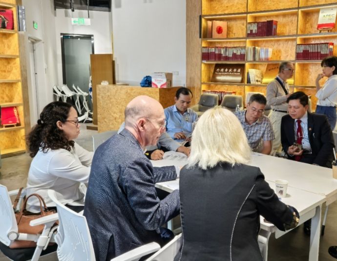 2025年4月,海内外人士在湖南洋湖国际社区的外国专家书屋中交流。 (图/中新社)