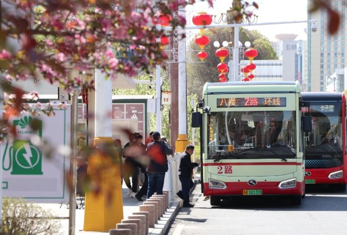 4月23日,一辆新开通运行的2路汽车停靠站边,乘客有序乘车。(图/中新社)