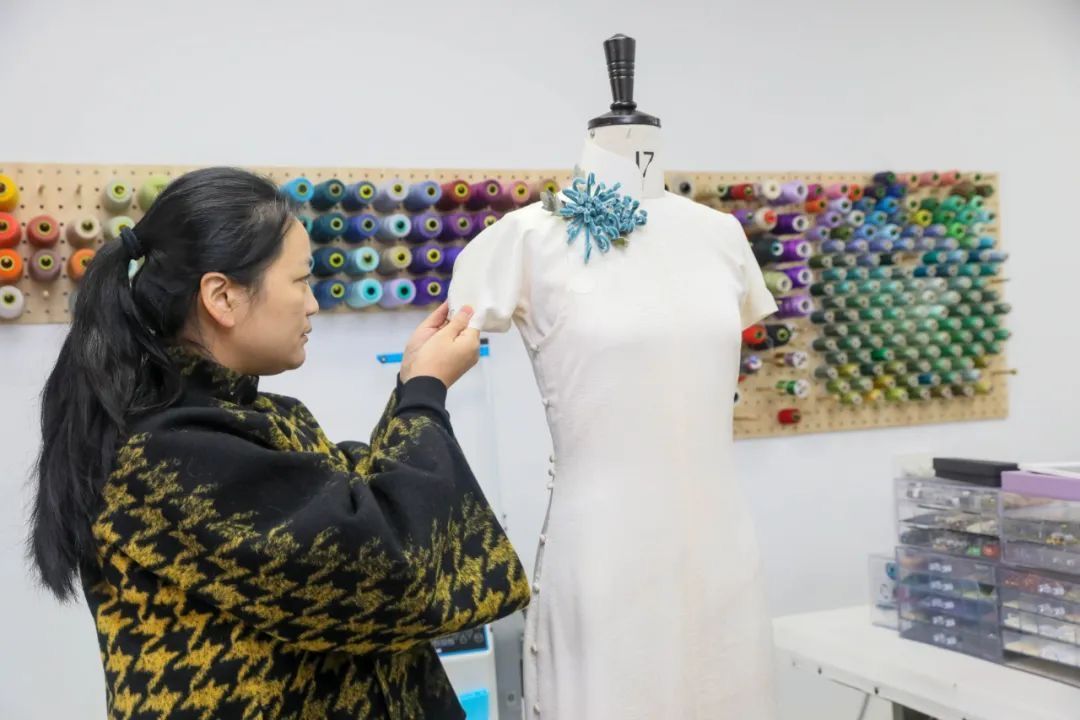 2025年3月,韩敏在位于浙江德清新市古镇的工作室内制作旗袍。(图/德清县融媒体中心)
