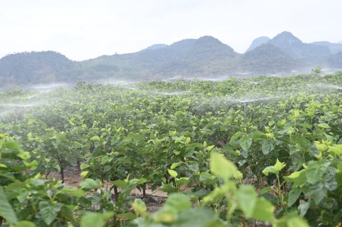 初夏时节,在广西来宾市忻城县红渡镇600亩现代化桑园示范基地内,智慧水肥一体化灌溉设备正在对连片的桑树进行喷灌作业,忻城县红渡红创兴投资有限责任公司总经理韦建学正在基地里忙碌着。