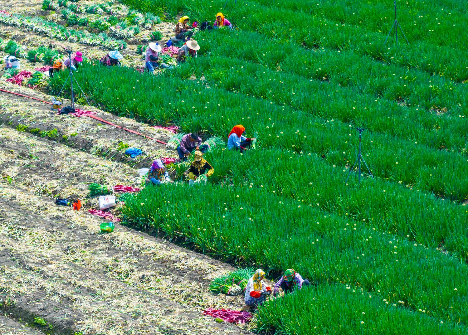 5月21日,在江苏省兴化市兴东镇周韩村,村民在采收香葱。近日,江苏省兴化市兴东镇香葱种植基地进入采收高峰期。农户们抢抓晴好天气,熟练收割、分拣、捆扎香葱,一派繁忙景象。(中新社)