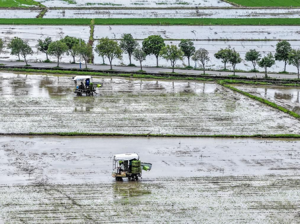 5月21日,海南省琼海市嘉积镇的农民在田间插秧。当天适逢小满节气,海南省琼海市的农民抢抓农时采用"双抢"模式,在田野上收割成熟早稻并及时整地插秧,同时加强对作物的田间管理,力争农业增产增收。(中新社)