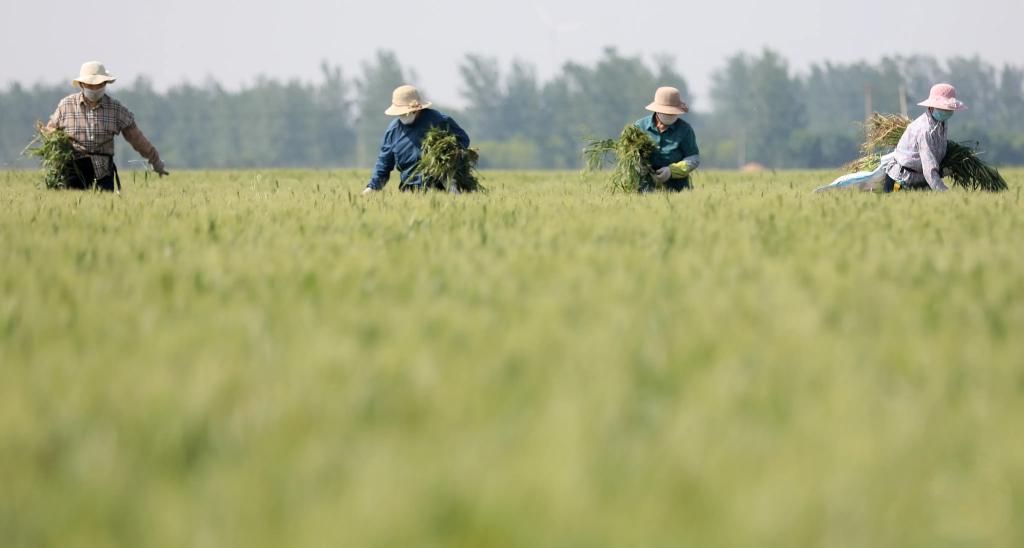5月20日,河北省沧州市沧县捷地回族乡马辛庄村的农民进行麦种提纯作业。(新华社)