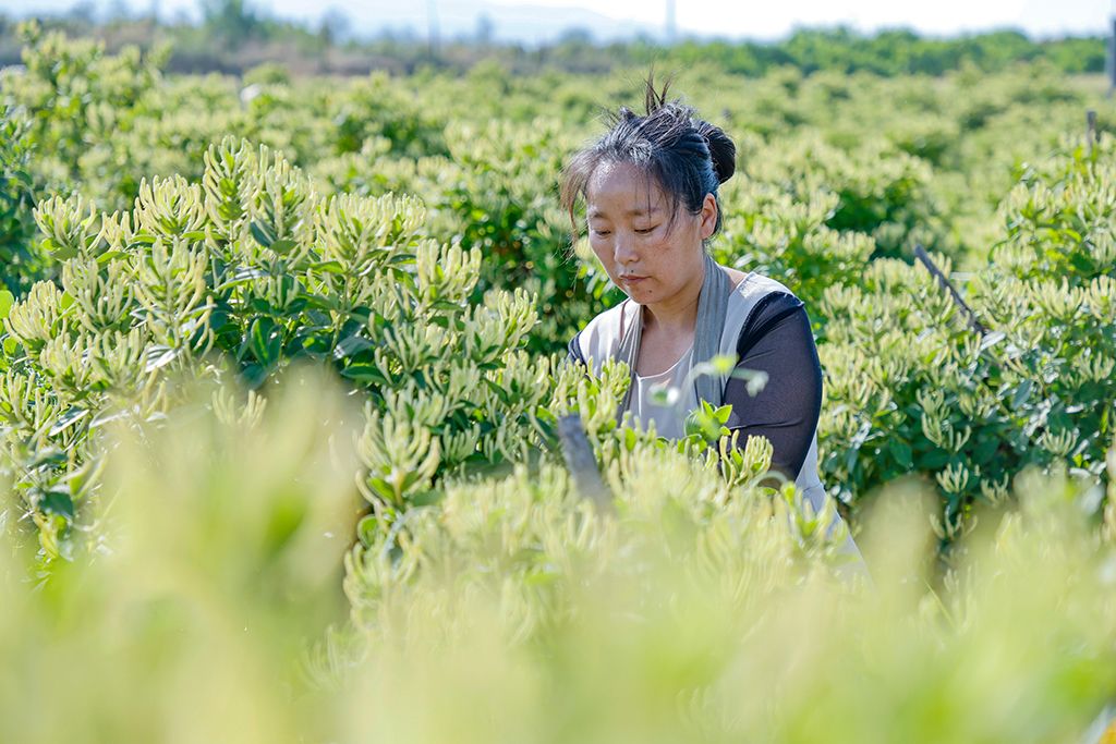 5月20日,山西省运城市平陆县的金银花进入采摘季,当地村民们忙着采摘头茬金银花,现场一派丰收景象。(人民图片网)