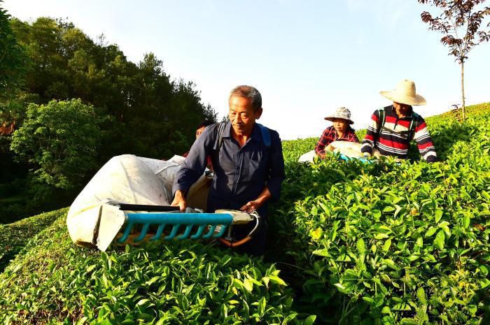 连日来,在湖北省保康县,茶农们正用“便携式采茶机”采摘茶叶。机械采茶不仅节约人工成本、提高采摘效率、促进茶农增收,还可对茶树进行修剪管理。据悉,近年来,保康县锚定“中国高香茶核心产区”目标,推动茶产业链向国际化迈进。图为茶农在茶园内采茶。(中新网)