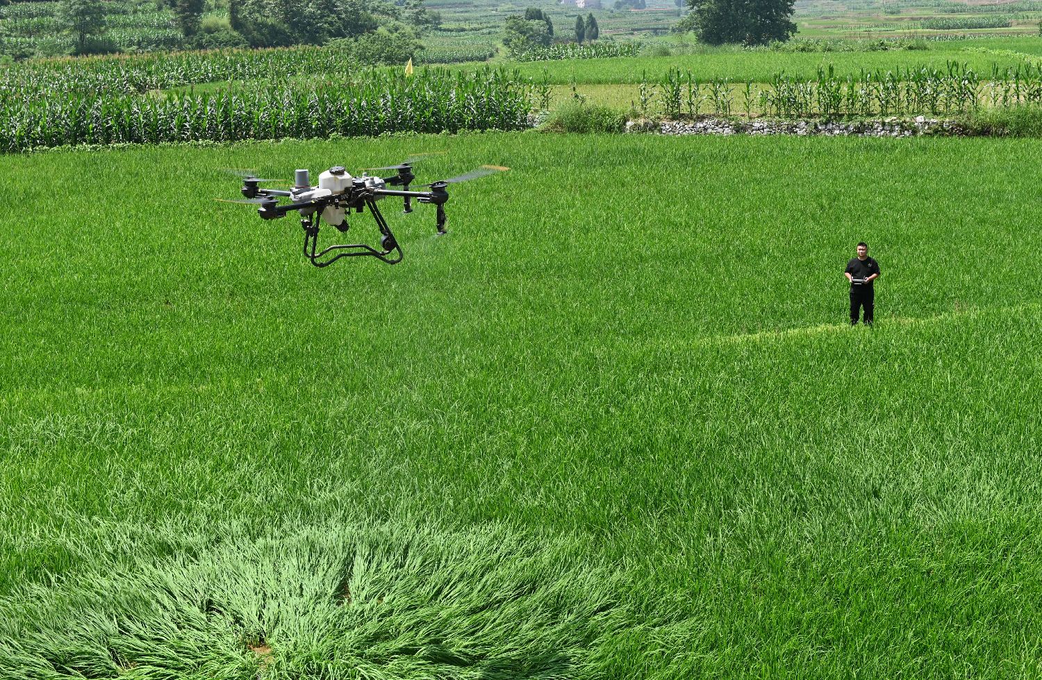 6月5日,在湖南省邵阳市洞口县杨林镇新合村,村民操控植保无人机对水稻进行施肥作业。芒种时节,洞口县农民抢抓农时,忙碌在田间地头进行农作物管护、种植、收获等农事作业,确保丰产丰收。(中新图片)