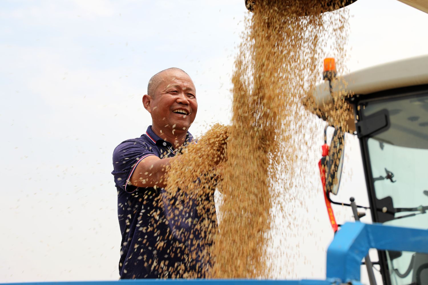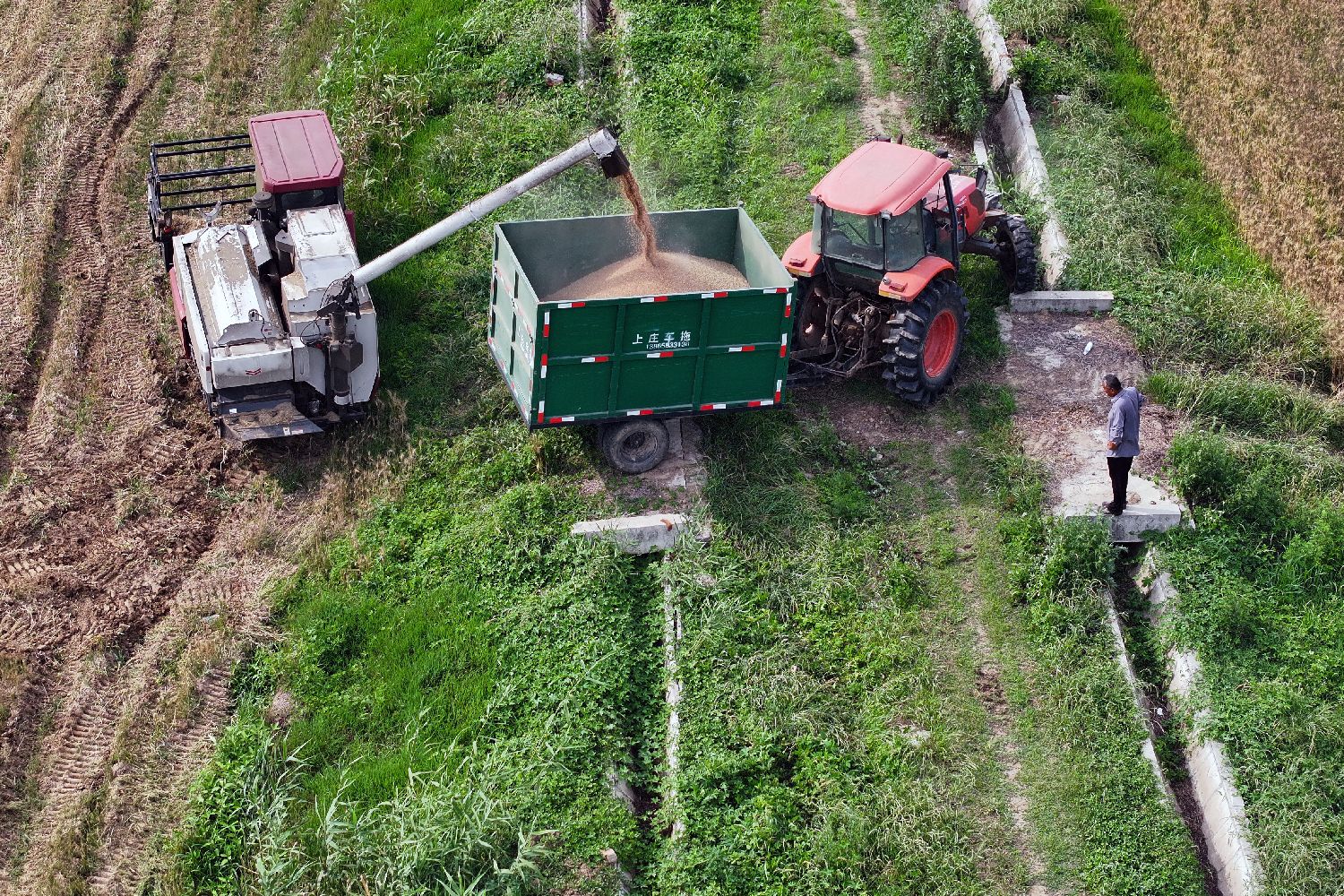 6月4日,江苏南京,工作人员驾驶收割机将收割的小麦装入运输车内,芒种节气将至,中国南方稻麦两熟区夏收夏种迎来关键时期。(中新社)