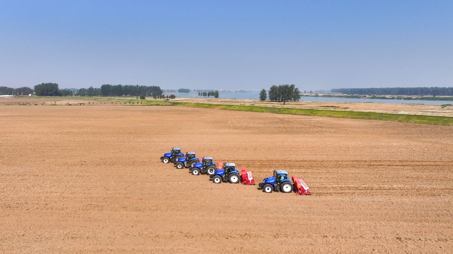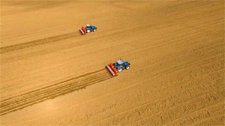 近日,安徽蚌埠五河县朱顶镇,一台台大型玉米一体化播种机正穿梭在田地里,正在进行玉米播种作业。(人民网)