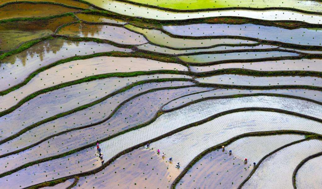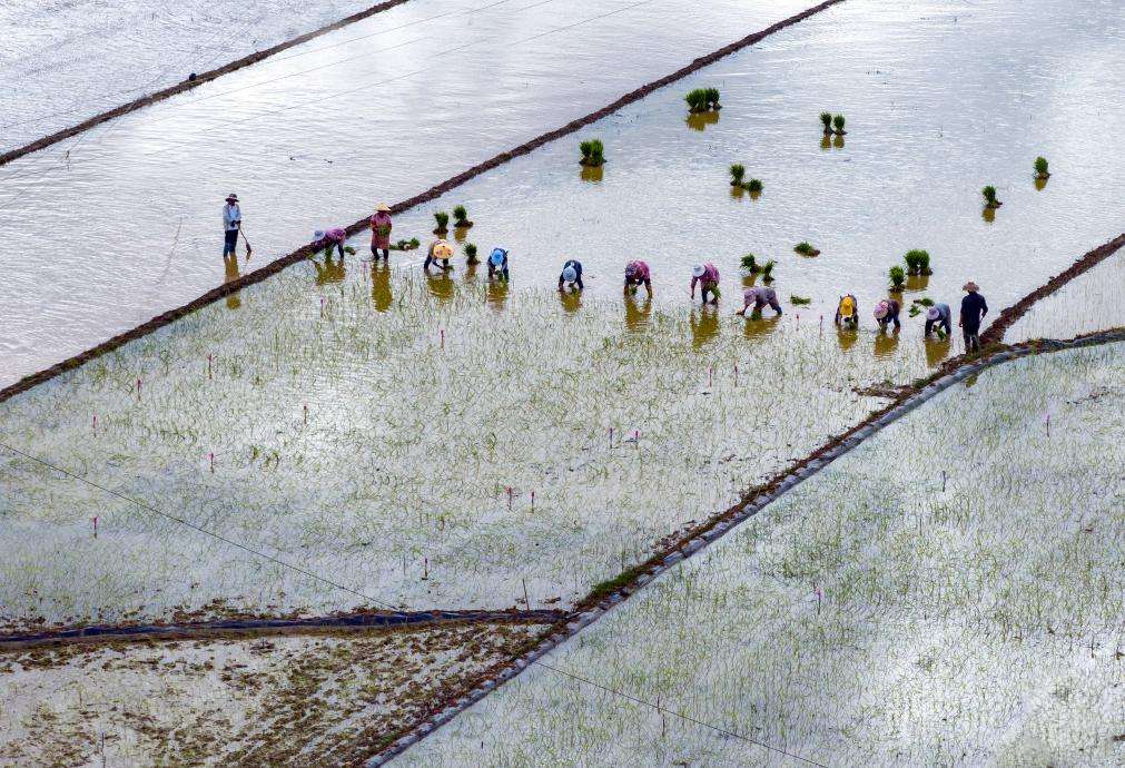 6月4日,云南省文山市新平街道高末社区茂地村的农民在田间栽插水稻秧苗。(新华社)