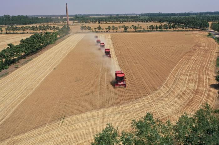 6月5日,芒种时节,处于鲁北平原的山东省滨州市博兴县59万亩小麦全部成熟,当地进入麦收农忙时节,农民抓住农时进行小麦抢收和田间管理,以确保全年粮食生产有好收成。(中新图片)