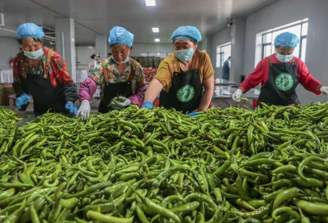 7月7日,分拣女工在富硒辣椒产业园的分拣中心工作。 (图/中新社)