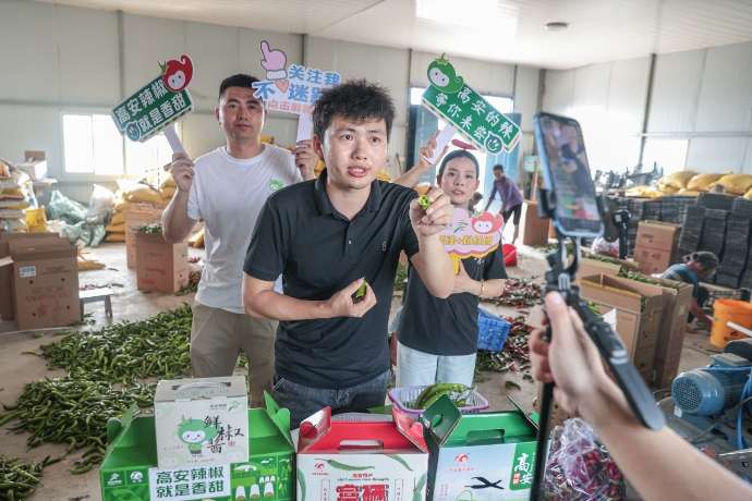 在江西省高安市富硒辣椒产业园的分拣中心,分拣女工们手指飞快地在面前的辣椒堆里舞动,伴随着一旁年轻人直播带货的声音,她们熟练地将辣椒分拣、装箱、打包。这份家门口的工作,在产销旺季可为她们带来每月最高约3000元(人民币,下同)的收入。