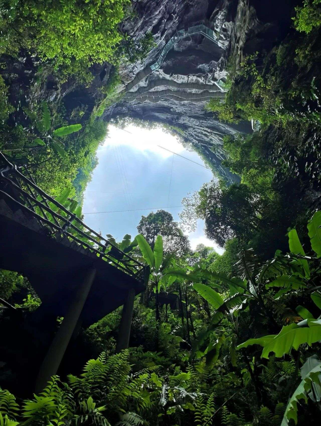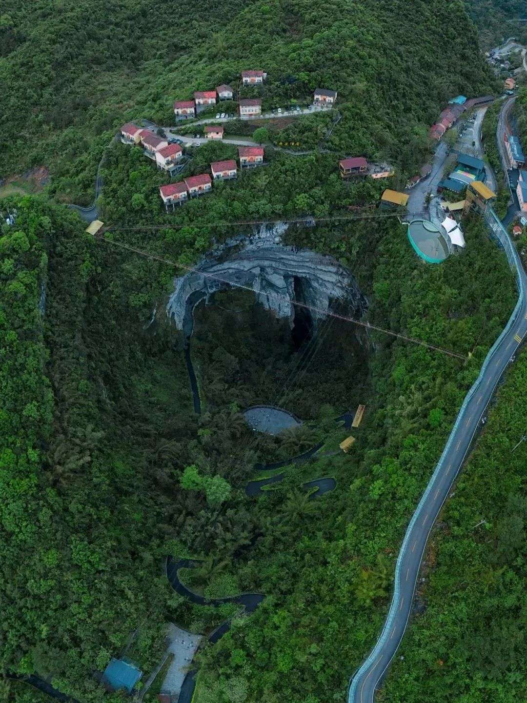 棉花天坑,深326米,宽305米,形似大型漏斗,一削千丈的绝壁直插地下,栈道在悬臂上盘旋引向坑底,犹如地球表面与地宫世界的连接口,险、奇、峻、雄、秀、美!置身其中,如入秘境。 沿着建在悬崖峭壁上的栈道步行而上,是更为大众的观赏方式,你可以慢慢地欣赏天坑奇观。(广西文化和旅游厅微信公众号)