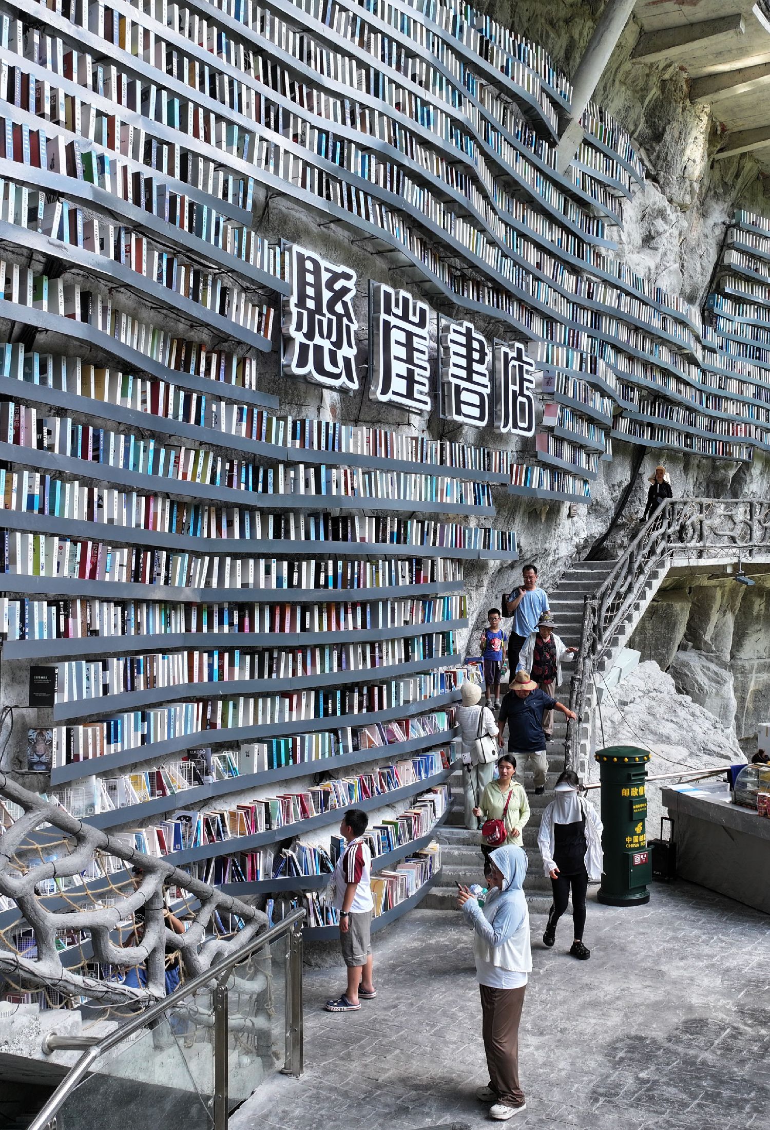 棉花天坑悬崖书店上布满图书。(央视网)