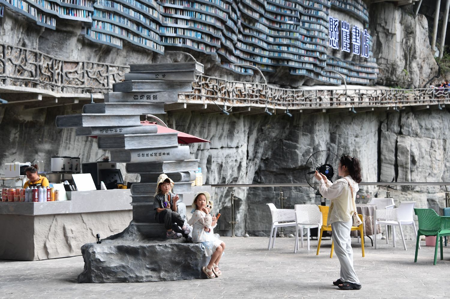 7月5日,游客在棉花天坑悬崖书店打卡拍照。(中新社)