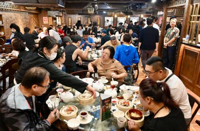 5月28日,香港百年老字号茶楼“莲香楼”在尖沙咀开设首家分店,该分店共上下两层,为24小时营业。图为“莲香楼”尖沙咀分店店内坐满食客。 (图/中新社)