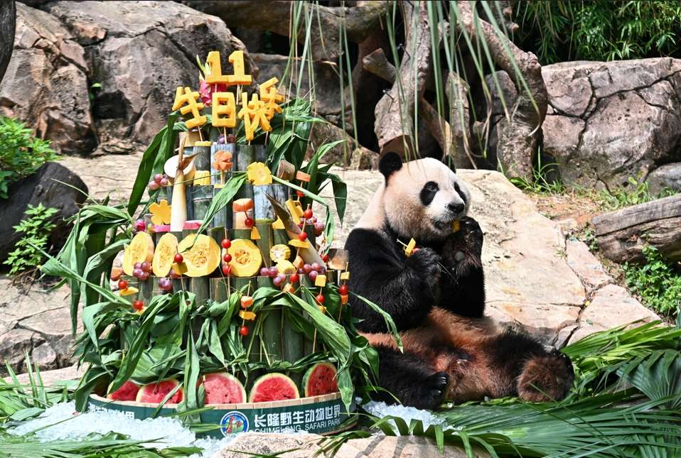 全球唯一存活的大熊猫三胞胎“萌帅酷”7月29日迎来11周岁生日,广州长隆野生动物世界为它们举办了庆生活动。