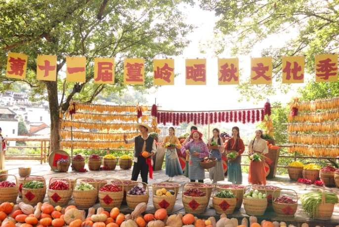 在第十一届篁岭晒秋文化季活动启动仪式现场,一场极具当地特色的丰收巡游快闪吸引了民众目光。村民们自导自演的节目轮番上演,拖拉机队、晒娘队、奇瓜异果队等9支队伍一边进行晒秋歌舞表演,一边与游客亲切互动。山崖边的徽派民居鳞次栉比,房前屋后的晒架上晒满了辣椒、玉米等农作物,构成了一幅幅丰收画卷。