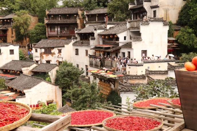 8月7日,第十一届篁岭晒秋文化季在江西篁岭古村正式启幕,当日村庄游客络绎不绝。(图/中新社)