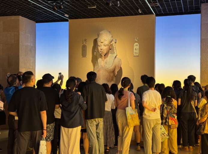 8月11日晚,“金字塔之巅:古埃及文明大展”展厅里仍有许多观众。(图/中新社)
