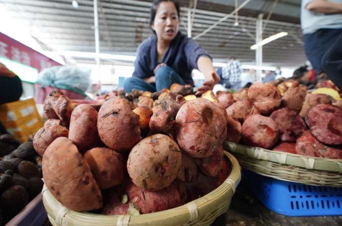 2024年7月3日,云南木水花野生菌交易中心售卖的见手青。(图/中新社)