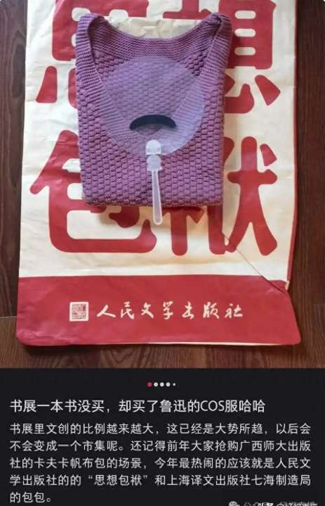 8月19日,2025上海书展在上海展览中心与上海书城落下帷幕。不少网友在社交媒体上分享了参展时买到的新书和文创产品。其中,由人民文学出版社旗下文创品牌“人文之宝”推出的“鲁迅系列·大先生的毛背心”格外引人注目。