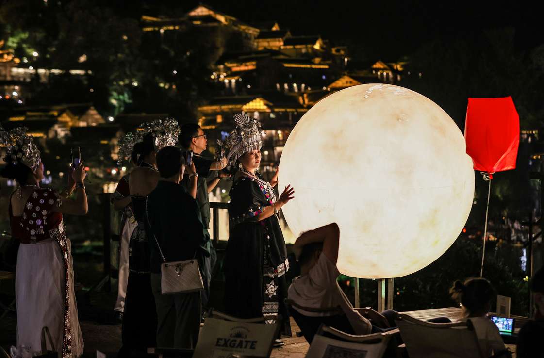 北京时间10月4日晚,游客在贵州遵义乌江寨梯田广场设置的月亮模型前打卡拍照。(图/中新社)
