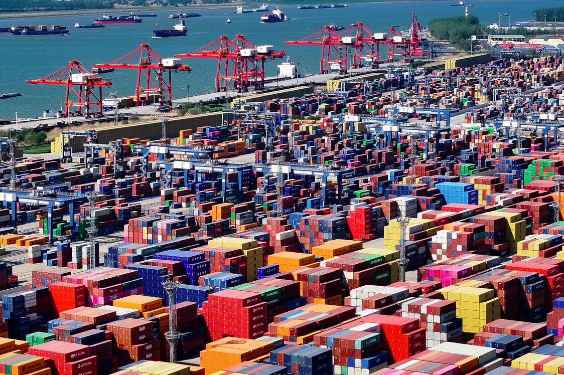 资料图为4月14日,航拍江苏南京龙潭港进出口集装箱码头。(图/中新社)