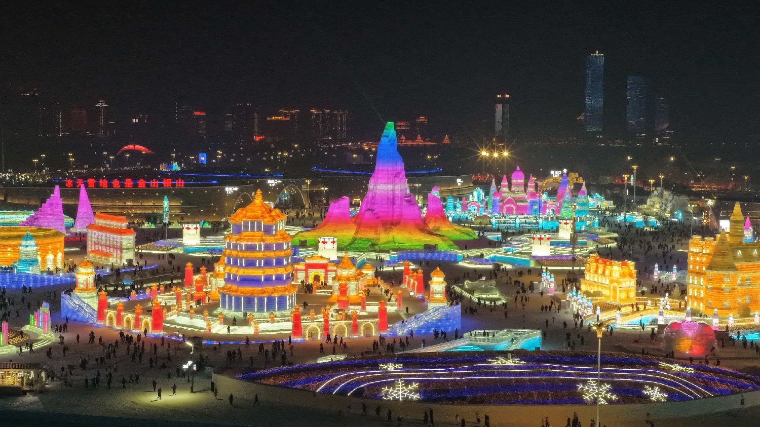 本届冰雪大世界以“冰天雪地童话世界”为主题,园区面积扩大到120万平方米,用冰用雪量达40万立方米,景观设计和建设体现“文化核心、历史脉络、国际交融”的理念,更加注重国际化表达与本土文化共生的美学。