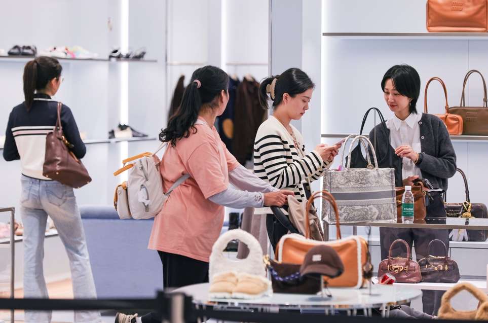 12月19日,顾客在cdf海口国际免税城选购箱包。海南自贸港18日正式启动全岛封关后,带动离岛免税购物人气高涨,众多顾客进店购物。(图/中新社)
