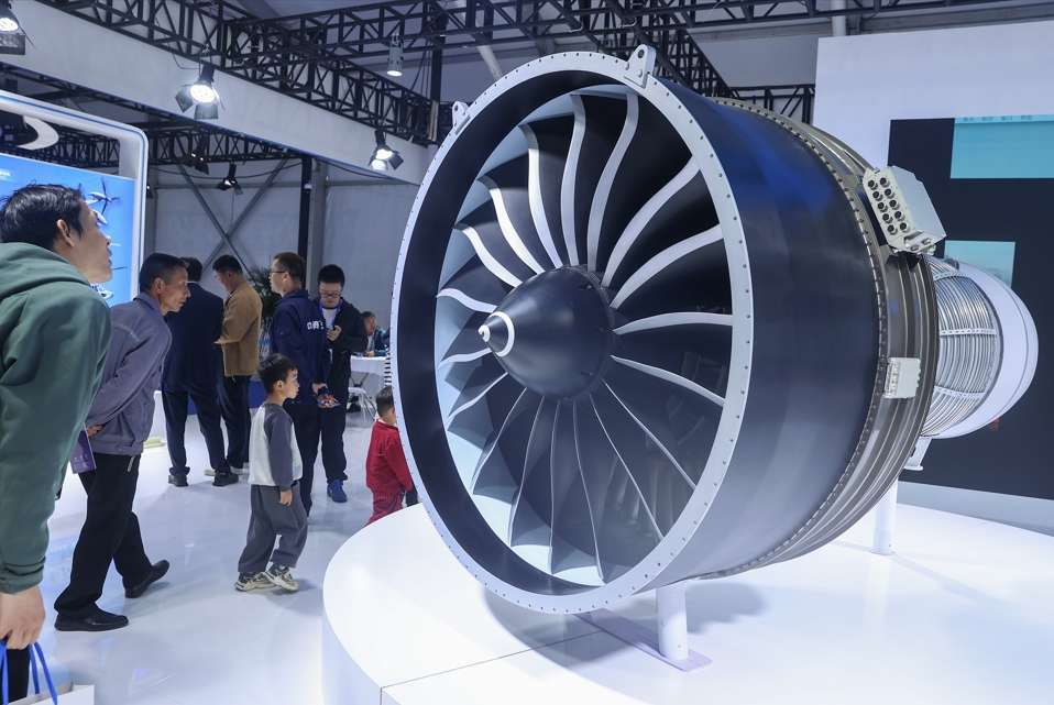 2025年10月31日,观众在2025南昌飞行大会暨航空产业博览会的航空产业展区参观中国航空发动机集团有限公司展出的CJ2000发动机模型。当日,2025南昌飞行大会暨航空产业博览会开幕,活动持续至11月2日。(图/中新社)