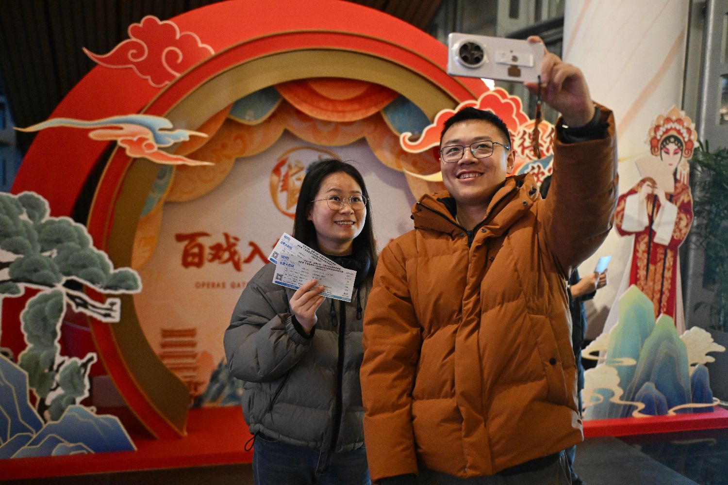当地时间1月11日晚,在合肥大剧院,观众手拿《穆桂英挂帅》演出票根拍照留念。(图/中新社)