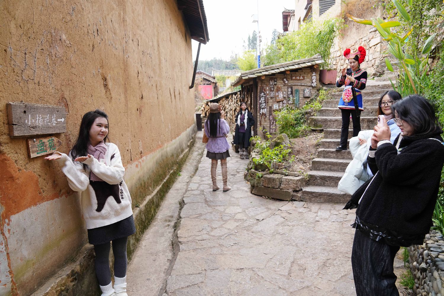 1月11日,游客来到乐居村游玩,期丽用手机记录下游客“打卡”的画面。(图/中新社)