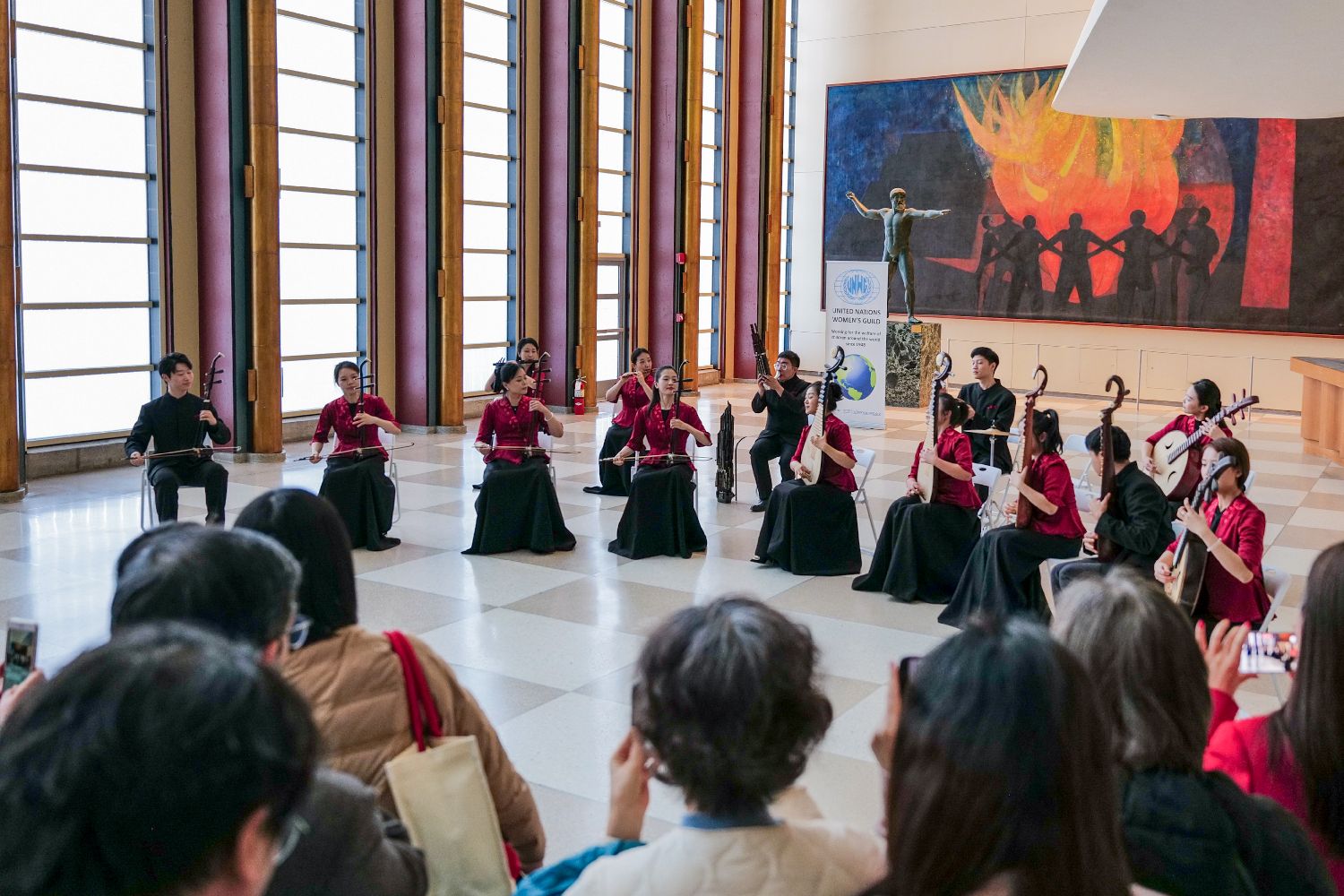 当地时间2月25日,来自中央音乐学院的民乐演奏家在纽约联合国总部上演快闪音乐会。图为音乐会现场。(图/中新社)