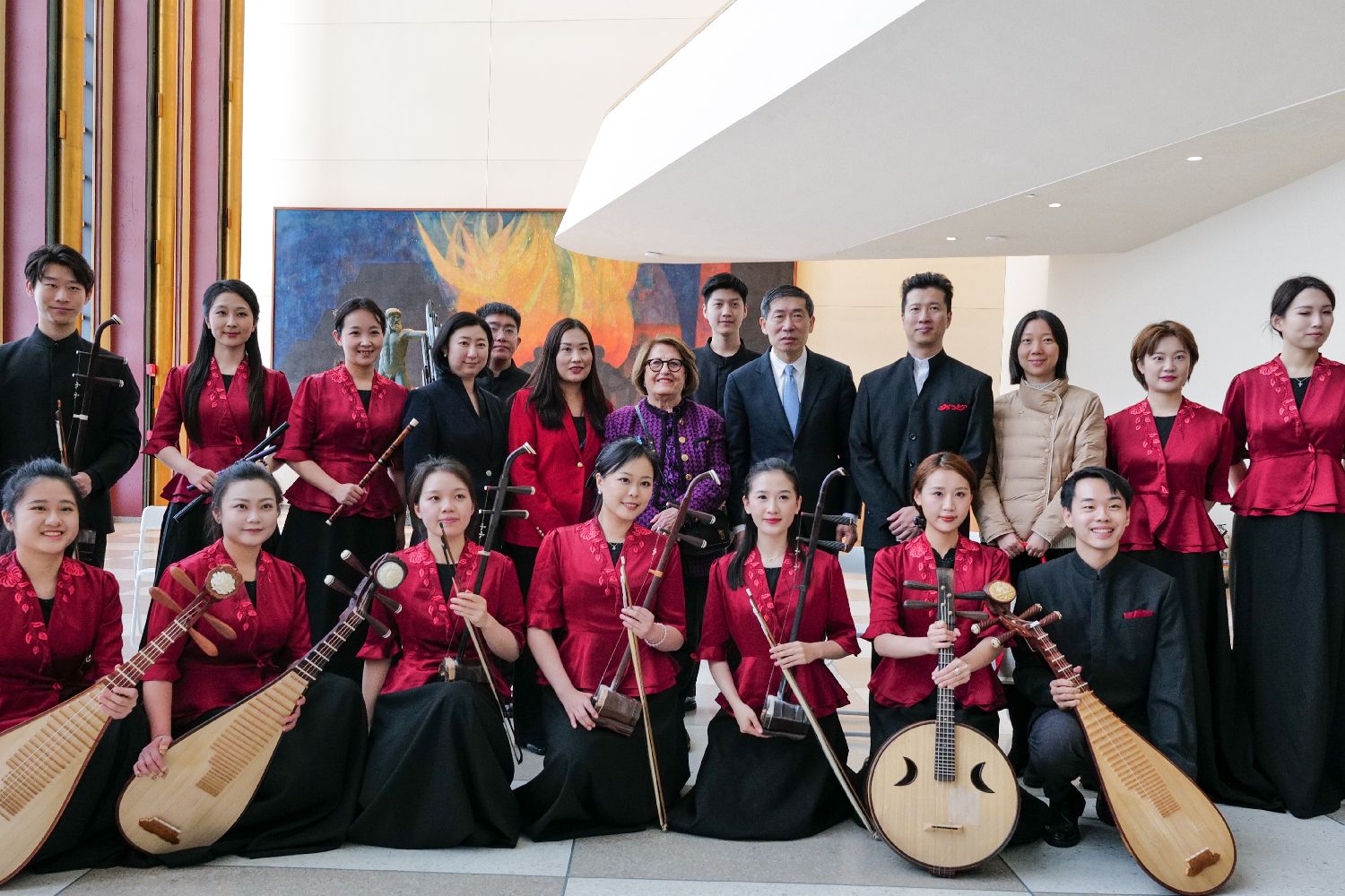 图为联合国副秘书长兼开发计划署副署长徐浩良、联合国妇女协会主席安妮特·海拉佩蒂安与演奏家及活动主办方代表等合影。(图/中新社)