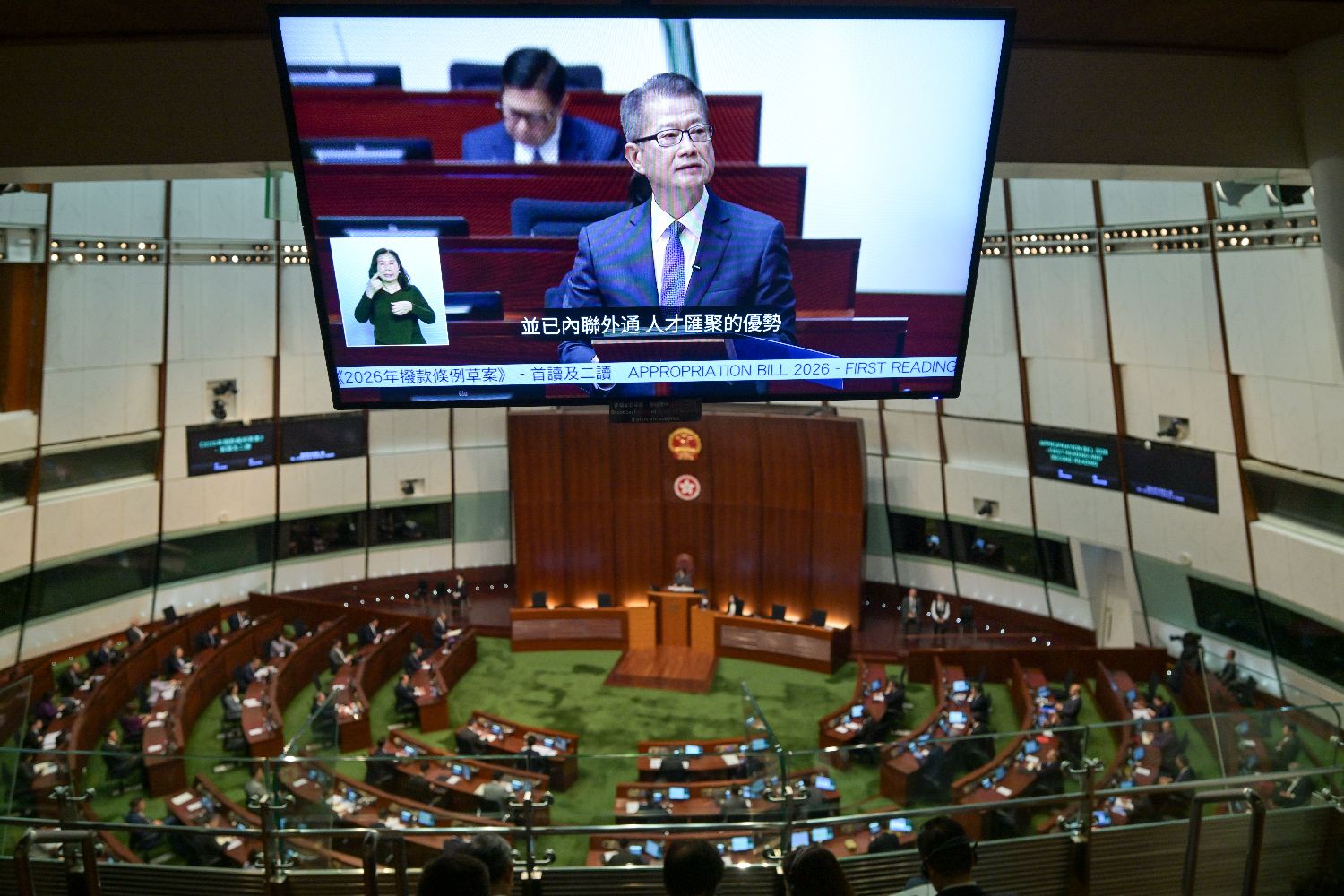 2月25日,香港特区政府财政司司长陈茂波发表2026/2027财政年度特区政府财政预算案。(图/中新社)