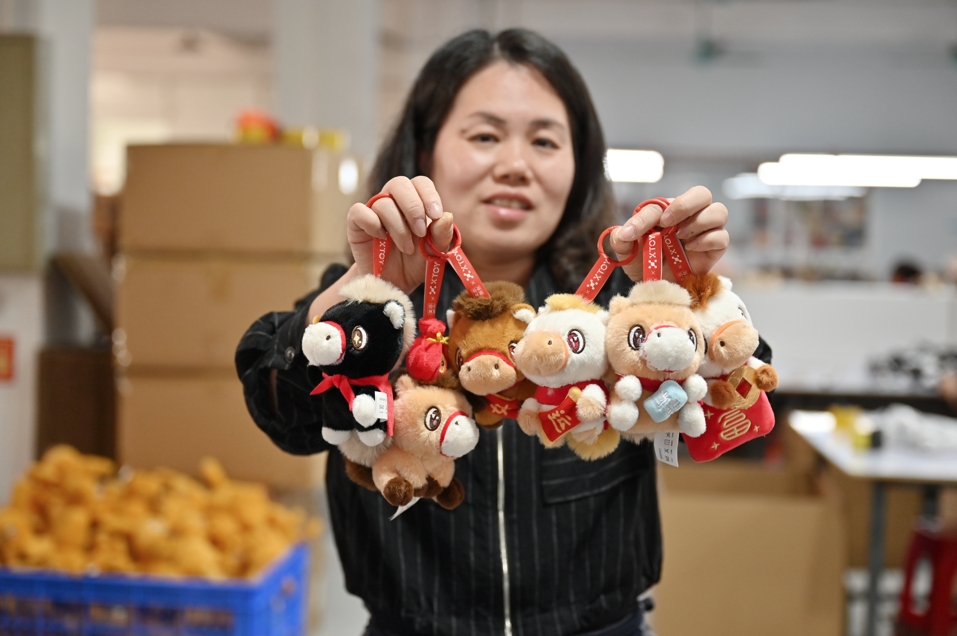 1月14日,广东省东莞市茶山镇的工作人员展示马年毛绒玩偶。随着马年春节临近,广东东莞这座“中国潮玩之都”迎来马年“潮玩”生产销售热潮。(图/中新社)