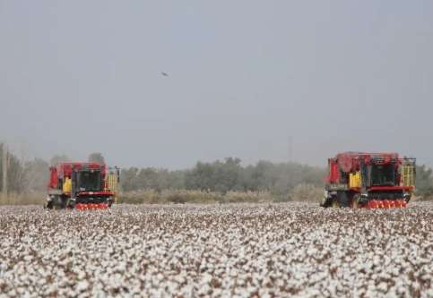 新疆巴音郭楞蒙古自治州尉犁县一处棉田内,大型采棉机正在作业。(图/中新社)