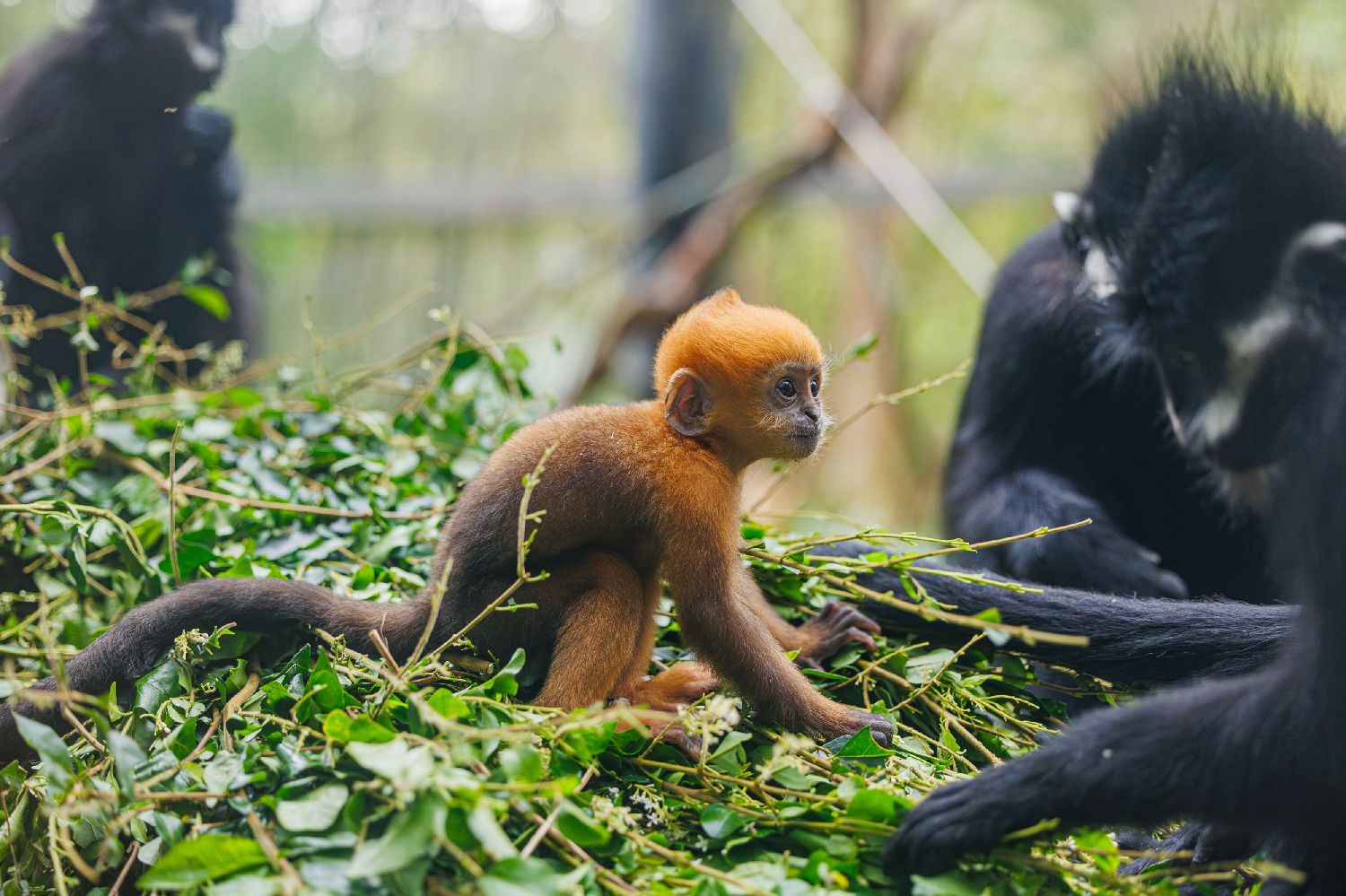 广州长隆黑叶猴幼崽满月亮相 全身金毛成小“明星”