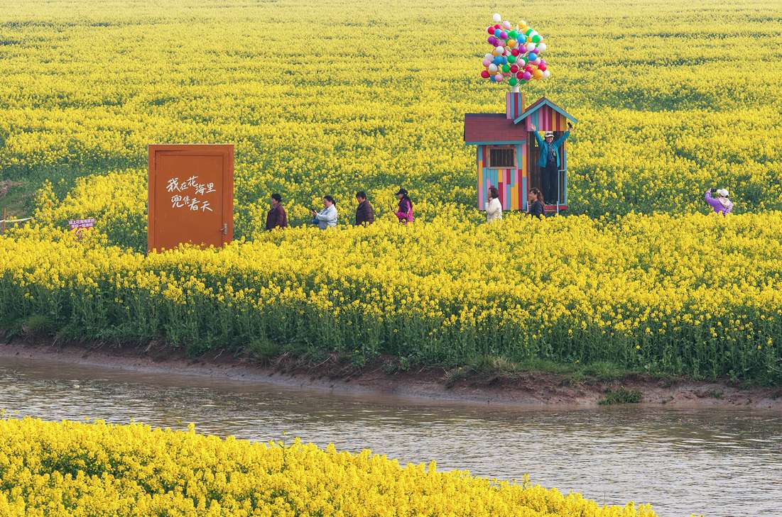 3月20日,江苏高邮“湖上花海”景区千亩金黄花田与高邮湖碧波交相辉映,构成一幅春日胜景,吸引八方游客共赴这场春天的约会。(图/中新社)
