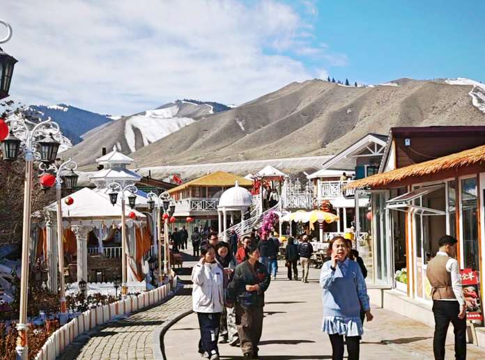 3月29日,新疆乌鲁木齐县萨尔达坂乡白杨沟村黎弯德咖啡小镇内游人如织。(图/中新社)