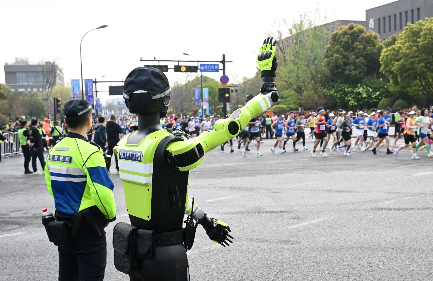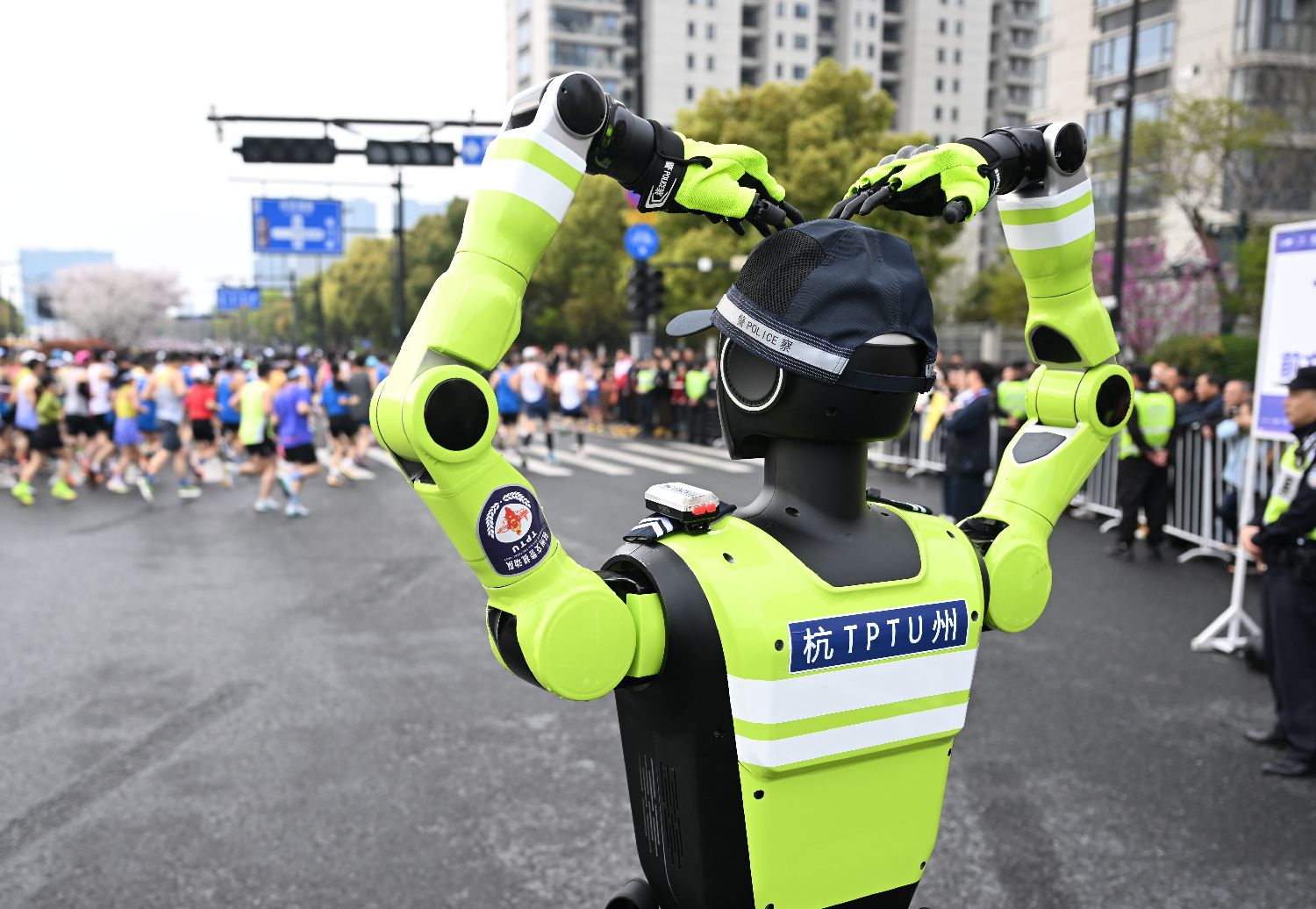 3月29日,AI交通管理机器人(右)在交警旁边引导马拉松跑者。当日,2026杭州梦想小镇半程马拉松在浙江杭州余杭未来科技城开跑。(中新社)
