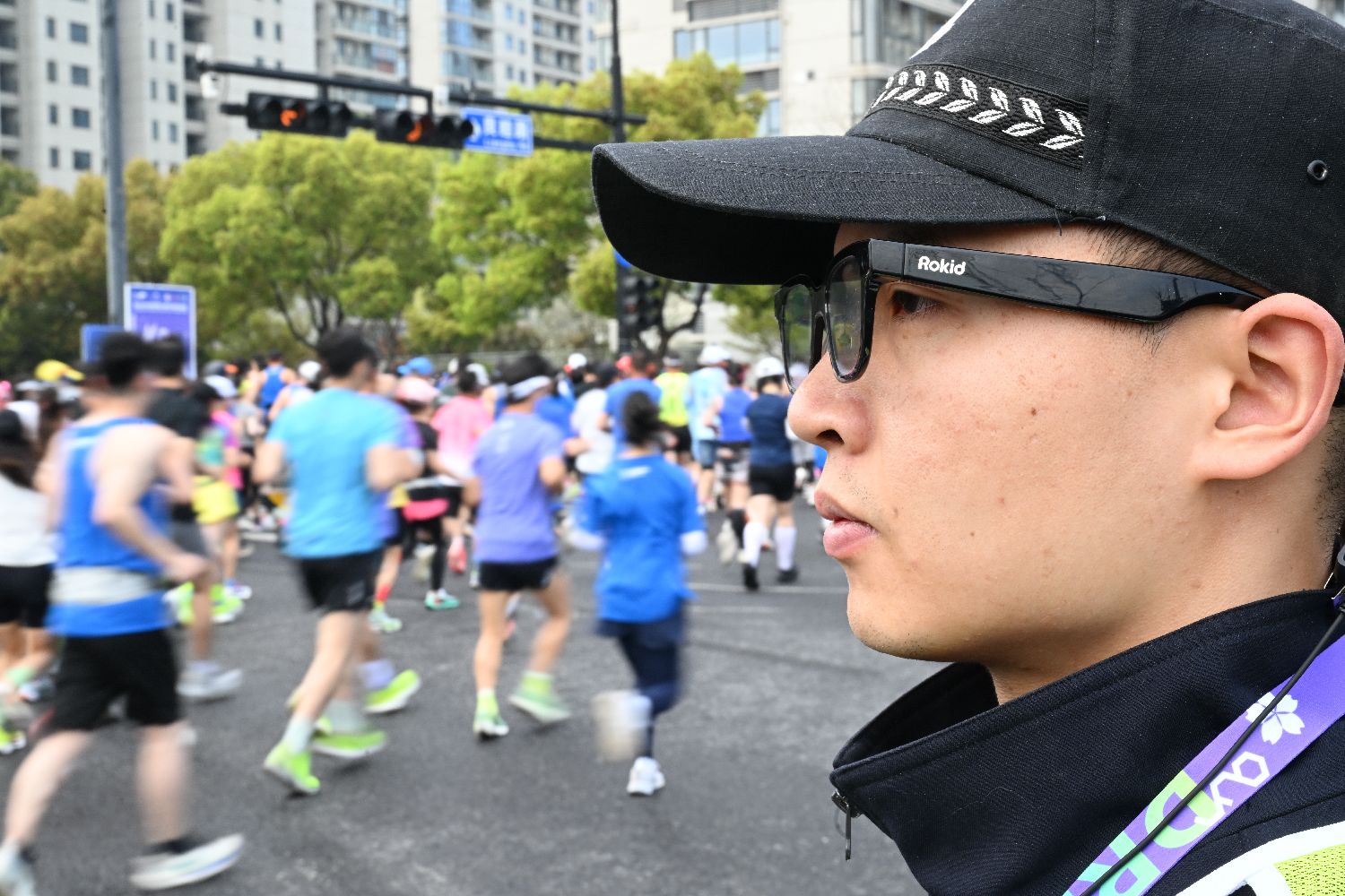 3月29日,民警佩戴AR智能眼镜在马拉松现场执勤。(中新社)