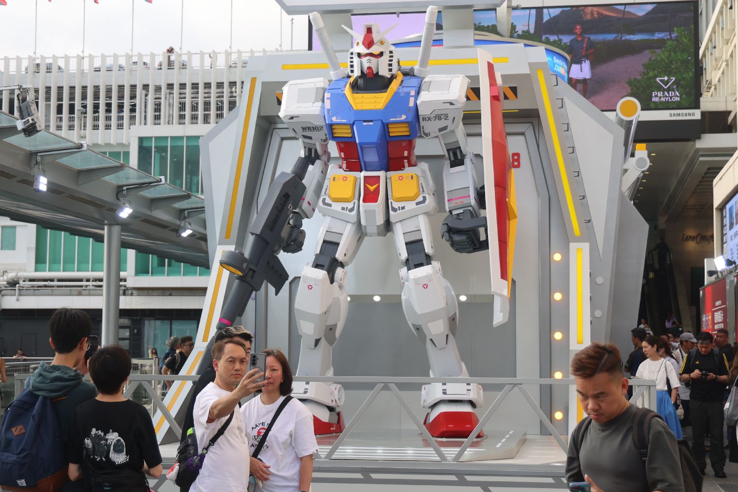 3月30日,市民游客与5米高“高达”装置合影打卡。(香港中通社)