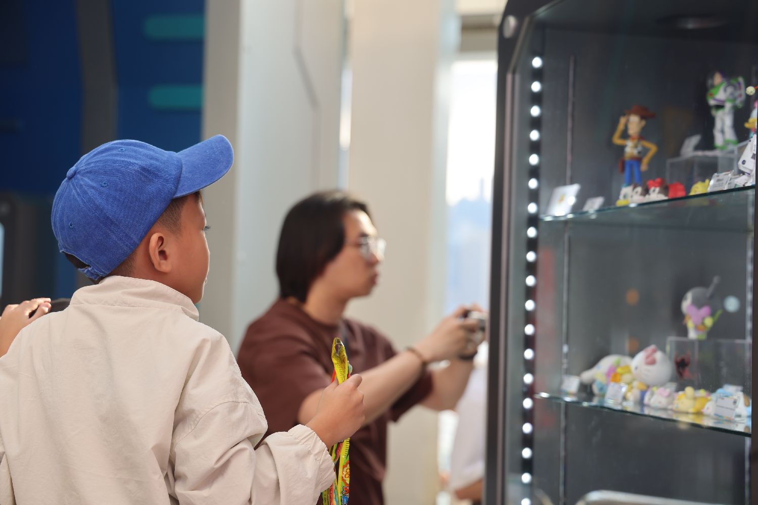 3月30日,小朋友在观赏主题玩具及手办。(香港中通社)