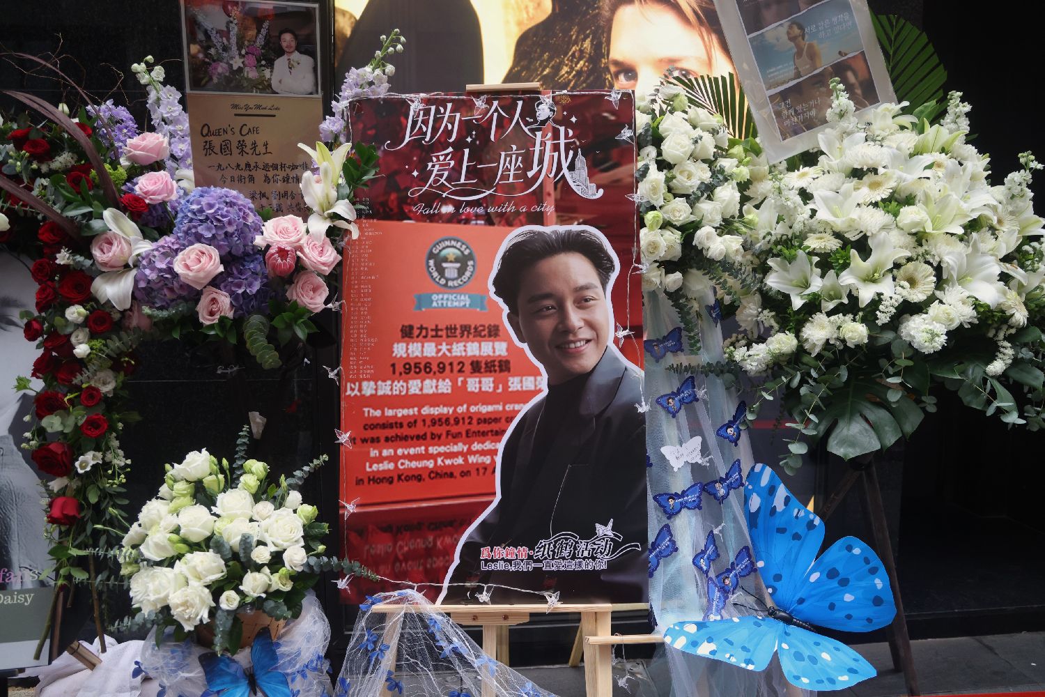 3月31日,香港文华东方酒店外人行道摆满鲜花、花牌与纪念展板,用以纪念张国荣逝世23周年。(香港中通社)
